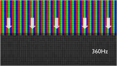 传统液晶驱动是从左到右单向进行,,在画面更新速度愈来越愈快的情况下,,位于驱动线路末端的右下角区域,,,画素的闸极来不及在短时间内获得足够电压,,,无法显示出正确的颜色资讯。。。。
